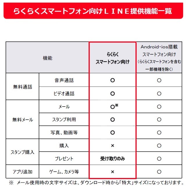 | らくらくスマートフォン向けLINE提供機能一覧 |