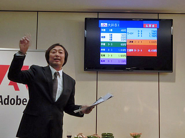 懇親会は、東京シティ競馬場の特別席(VIP)で行われた。昨年、アドビ日本法人設立20周年であることを記念し「アドビシステムズ賞 創立20周年記念」として特別協賛した。今年も当日の第9レースを「アドビ賞」として特別協賛した。