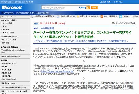 日本マイクロソフトは2011年8月26日、ベクター、ヤマダ電機およびヨドバシカメラのオンラインショップから、一部のMicrosoft Windows 製品およびMicrosoft Office 製品のダウンロード販売を同日午前9時より順次開始したことを明らかにした。取扱いオンラインショップおよび提供されるダウンロード製品は、今後順次追加していく予定だ。