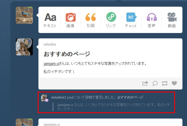 Tumblrで、たとえば自分がフォローしている相手のことを紹介する記事を投稿しようとした場合、その相手に、自分がブログ内であなたのことを取り上げたよ、ということを通知することができる。これが言及機能だ。