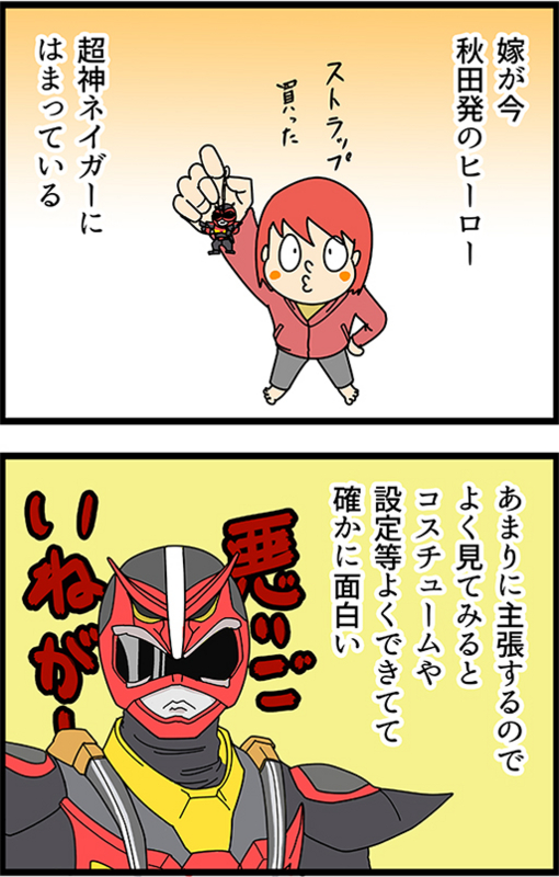 超神ネイガー 2015年02月24日 最近、嫁が面白い面白いというので、サイトを見てみると、確かに良くできていて水木一郎の主題歌まで作ってありました。 ネイガーはナマハゲがモチーフになっているらしく、キリタン・ソード(きりたんぽ)とブリコガン(はたはたの形をした銃)を武器にしますが、普段は農 ... 続きを読む