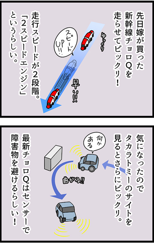 いまどきのチョロQ 2015年02月26日 センサーのチョロQは「Q-eyes」という名前で、一回充電すると10分走行するそうです。 動画を見る限りでは結構敏感に反応してます。最近向上しているロボット技術はこういう所にも反映されてるのかもしれないですね。 最近のチョロQは凄いなぁ。。 個人的にはもうラジ ... 続きを読む
