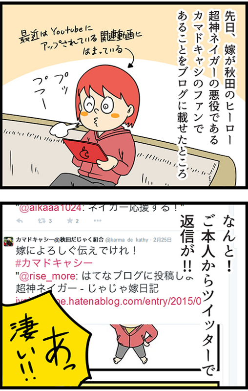 カマドキャシーから 2015年02月28日 まさかご本人からリツィートされるとは思ってなかったので、ビックリしました。 親切だなぁ。 カマドキャシーはオカマの悪役キャラなんですが、全く憎めない性格で、ワンピースでいうところのボンクレーみたいな感じです。(嫁はボンクレーが大好き) 神奈川から秋田まで ... 続きを読む