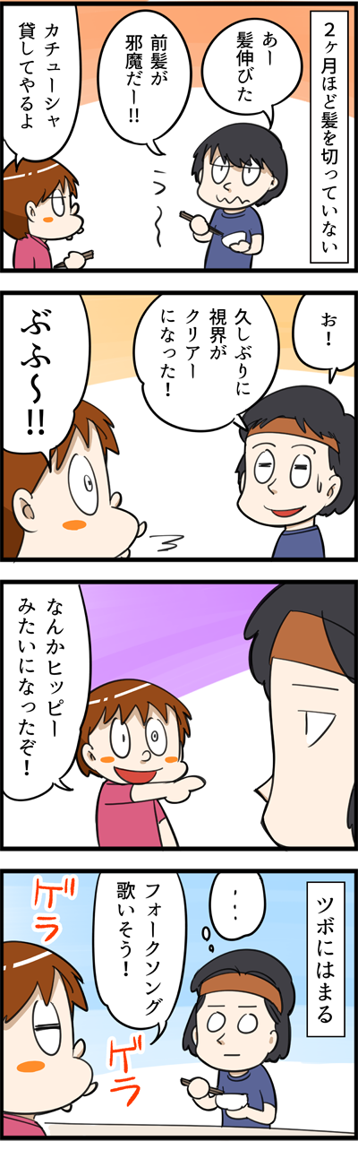 我が家のヒッピー 2018年05月26日 普段は1ヶ月少しもしたら切りたいところなんですが、気が付いたら2ヶ月更新してしまい、さすがにそろそろ限界です。嫁はどうも60年代のフォークシンガーっぽいのを連想したみたいで、「ギターを弾け」と言われましたが、うちにはギターが無いし、そもそも僕は弾けません。ヒ ... 続きを読む