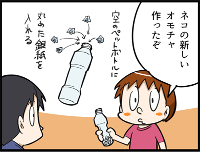 ペットボトルと銀紙で作るネコのオモチャ 2019年10月31日 ネコって卓球の玉とか小さくてコロコロよく転がるものが好きですね。うちに来たての小さい頃に、よく銀紙を小さく丸めたものを作って遊ばせていたんですが、今だに変らず楽しんでくれました。(たいてい家具の下に入って忘れられてしまうんですけど)透明のペットボトルに入 ... 続きを読む