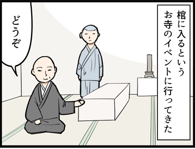 棺に入ってお経をあげてもらってきた 2019年10月25日 これなかなか面白い体験でした。僕は昔あったドリフのお葬式のコントを思いだしてしまい(知らない方スイマセン。。)、いまひとつ神妙な気持ちにはなれなかったんですが、棺の中から自分にあげられているお経を聞くって、かなりシュールな体験です。お坊さんはこうやって仮 ... 続きを読む