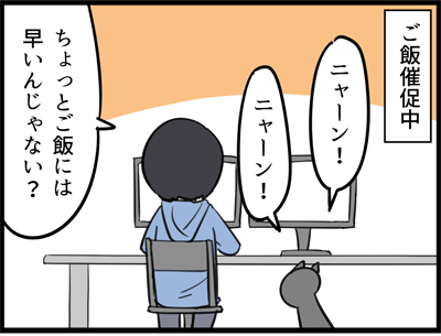 最近のご飯の催促の仕方 2020年01月30日 もっぱらご飯の催促をするのはナルの方なんですが、騒ぎ方が日に日にオーバーになる一方です。最終的にはモニターの前をグルグル回りはじめ、オシリをこちらに向けたかと思うと振り向きざまに大声で鳴きます。自分なりの意思表示なんでしょうが、何かの決めポーズっぽいです ... 続きを読む