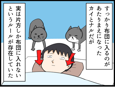 なわばりをめぐる熾烈な抗争 2020年03月30日 場所の取り合いになるとオスのカイの方が体が大きいせいか、いつもナルが負けて追い出されてしまうんですが、最近布団の上から一方的に叩いたり踏んづけたりして逆襲することを覚えました。布団の中では反撃できないカイはやがて外に飛び出してしまうんですが、やっぱり喧嘩 ... 続きを読む