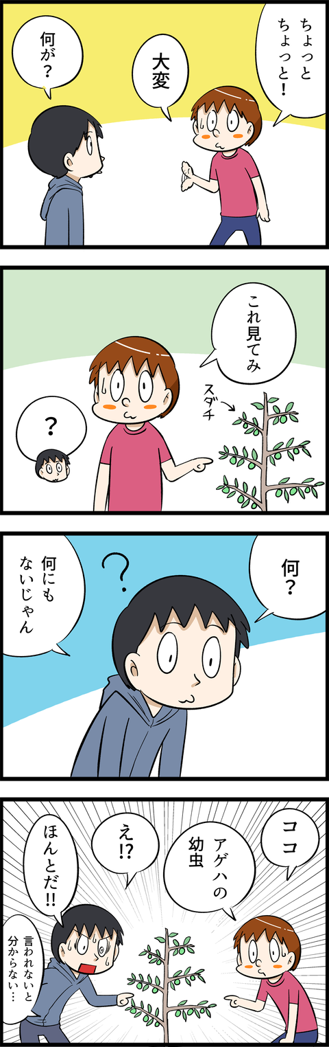 言われないと分からないアイツ 2022年11月27日 注意してたつもりだったんですが、アゲハの幼虫がふ化してました。しかもあちこち葉を食べられてて、そういえば黒い丸い粒が下に落ちてたんですけど、あれって幼虫のフンだったんですね。アゲハの幼虫って葉と同じ緑色なので、本当によく見ないと全然分からないです。アゲハ ... 続きを読む