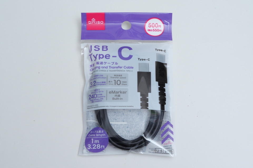 ところで2025年12月頃より、ダイソーは新たなUSB Type-Cケーブルの販売を始めています。それが今回取り上げる製品です。そちらは、データ通信がUSB 3.2 Gen2、最大10Gbpsに対応するとともに、USB PDの最大通電容量が240Wとされています。今回、遅ればせながら実際の製品を購入しましたので、前回の記事同様にケーブルの素性をチェックしてみたいと思います。なお、販売価格は550円でした。