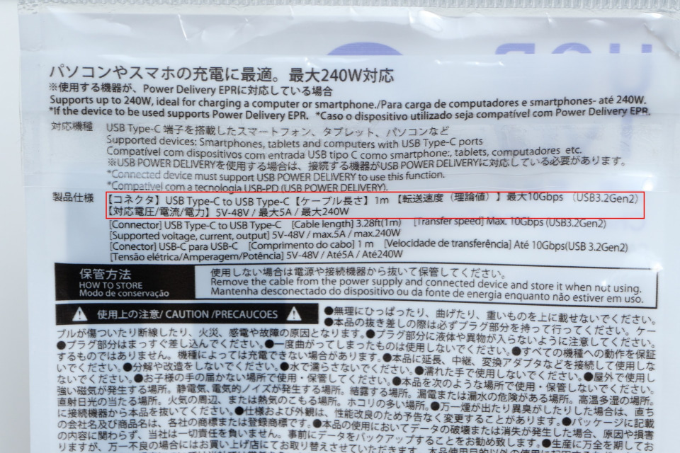 まずはじめに、パッケージの表記を確認します。パッケージ表には、ケーブル両端がUSB Type-Cであることや、ケーブル長が1mであることに加えて、データ通信がUSB 3.2 Gen2、データ転送速度が最大10Gbps、USB PDの通電容量が最大240W、eMarkerを内蔵していることを明記しています。また背面には、USB PDに関して対応電圧が5~48V、対応電流が最大5A、最大電力が240Wと記されています。この内容を見る限り、かなり高性能なUSB Type-Cケーブルと言っていいでしょう。