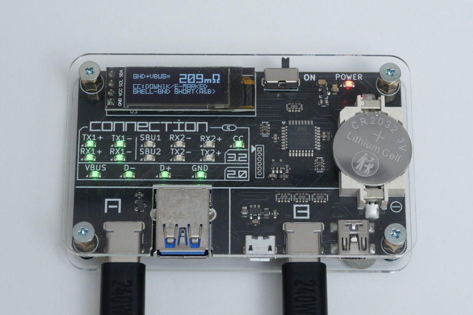 では、ケーブルの素性はどうでしょうか。まずはじめにUSB CABLE CHECKER 2を利用してチェックしてみました。すると、USB 3.2の項目ランプのうち、CCと、TX1±/RX1±(コネクタを反転させるとTX2±/RX2±)だけが点灯します。 これは、USB Type-Cケーブルで設定されているUSB 3.x用の全8本のデータ通信用信号線のうち半分の4本のみ結線され、残りの4本と、サイドバンド信号線(SBU1/SBU2)2本が結線されていないことを示します。