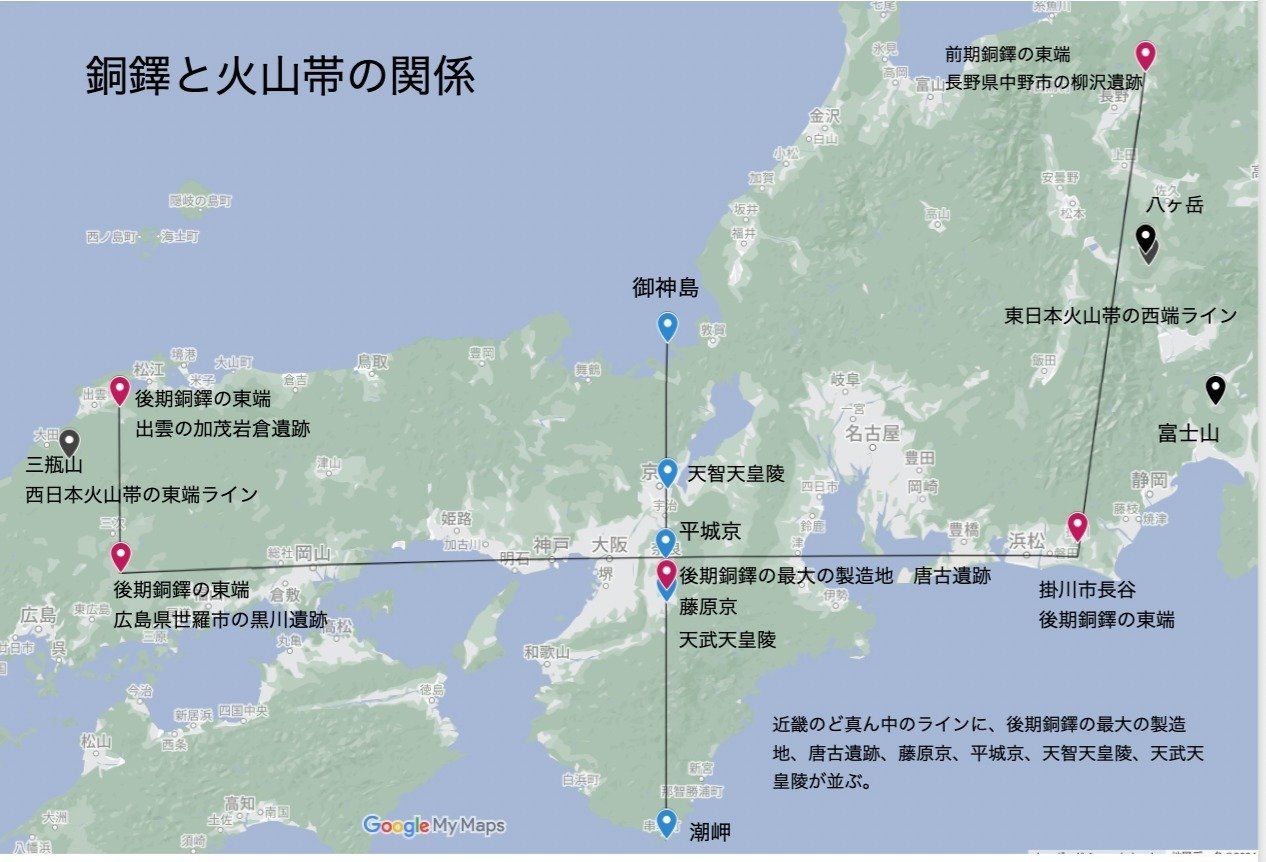 近畿地方は、日本列島の東西の火山帯から最も遠い場所であり、その中心軸に、銅鐸の製造拠点と、平城京や藤原京が築かれた。