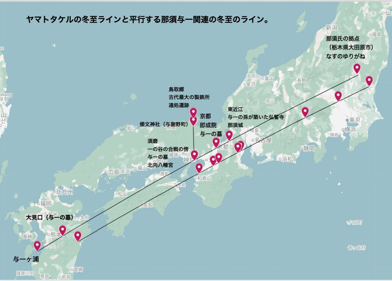 那須与一の墓がある大見口が、神戸や京都の那須与一の墓とともに冬至のライン上にあり、さらに那須氏の本拠である栃木の大田原で最もの重要な史跡である上侍塚古墳も、この冬至のライン上であることなど、屋島の合戦において英雄的活躍をした那須氏の痕跡には、意図的としか思えない神話上の彩がある。