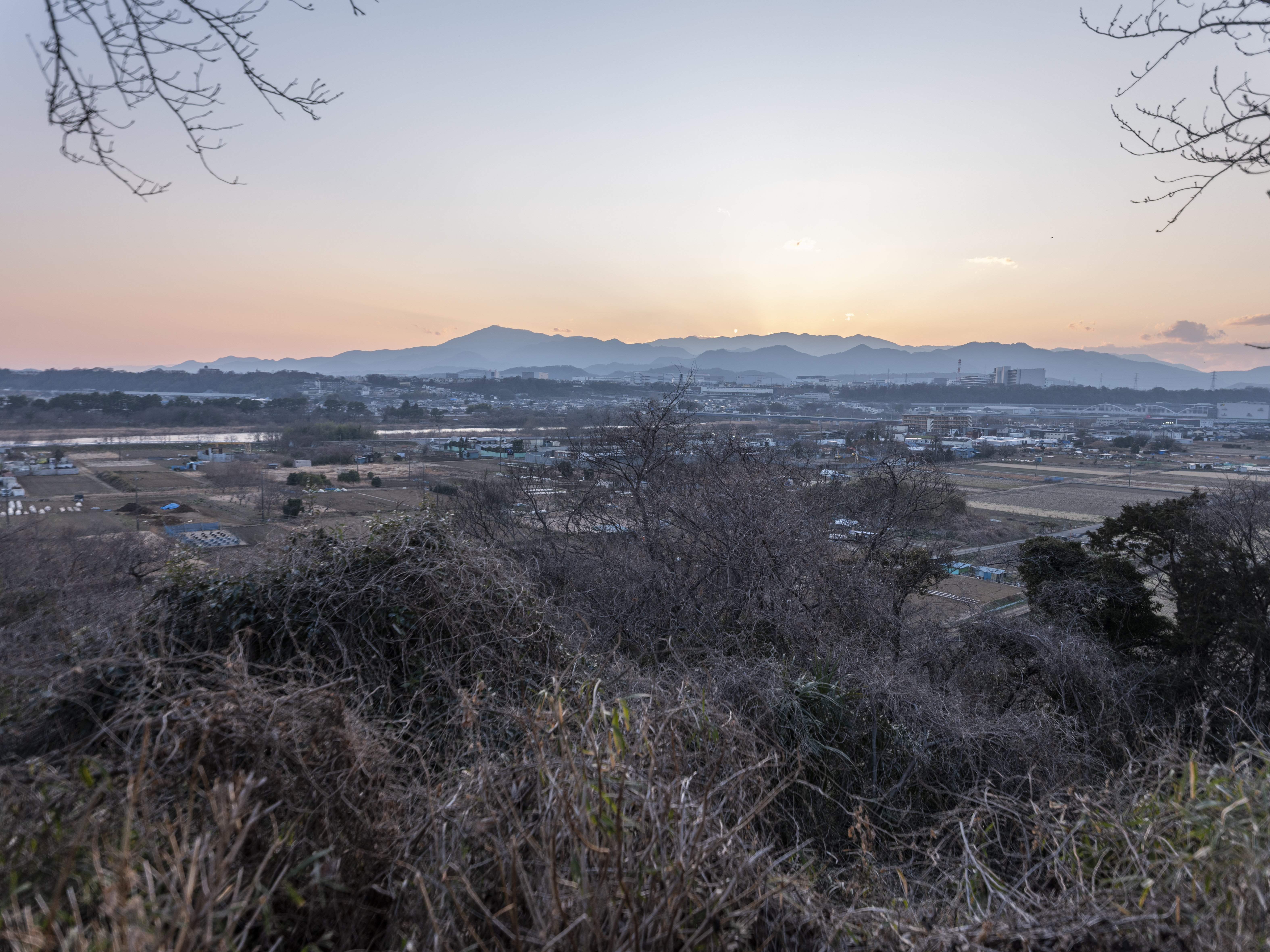 町田の田端環状積石遺構は、丹沢山地や富士山も見渡すことができる場所に築かれていますが、冬至の日に、神奈川県の最高峰である蛭ケ岳(1673m)の山頂に太陽が沈みます。