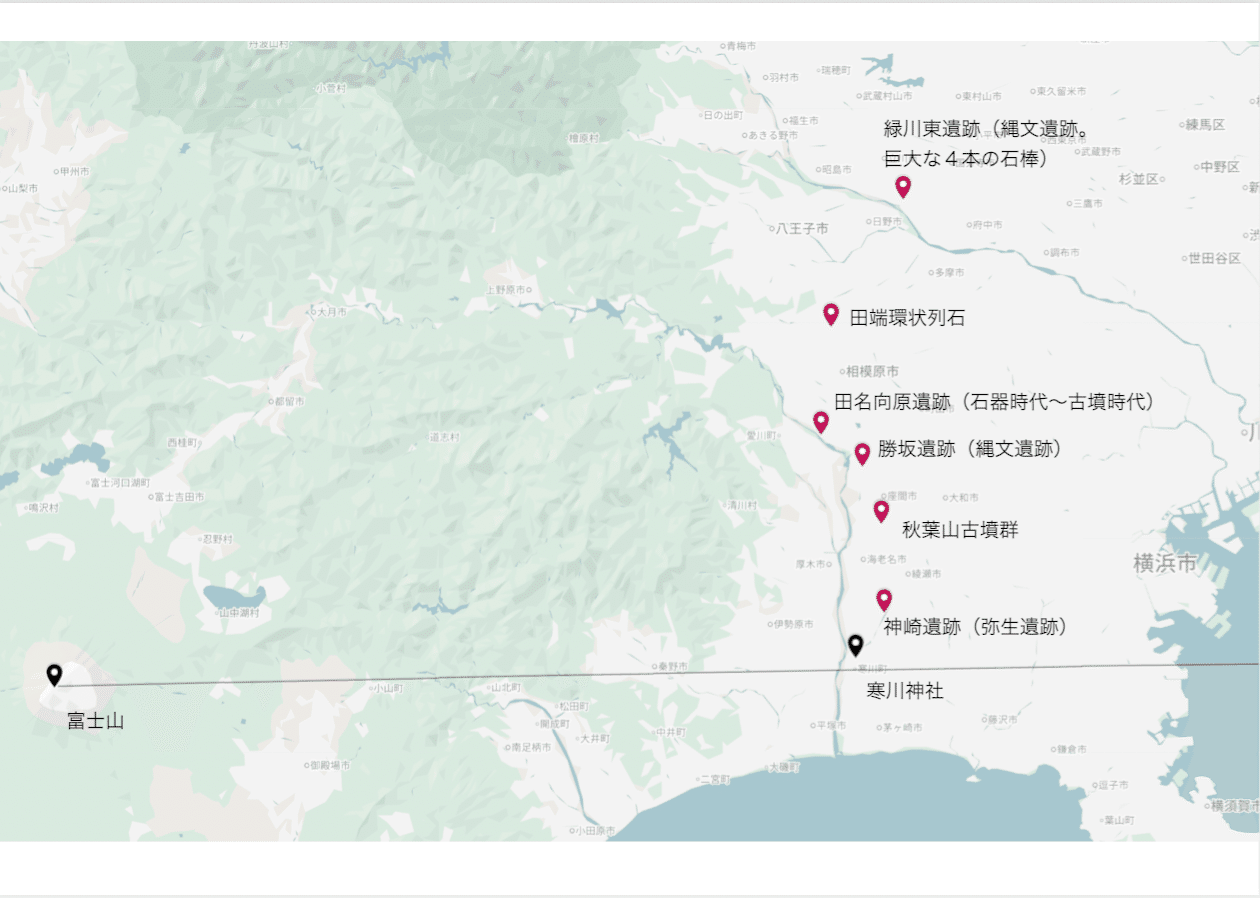 相模川下流に鎮座している寒川神社は、古代世界において、四方八方から人々がやってくる場所に築かれており、さらに、真西に富士山がそびえています。この東西のラインは、東に行けば房総半島の玉前神社が鎮座していることで知られ、富士山から真西にラインを伸ばしていくと、伊吹山や出雲大社につながっています。