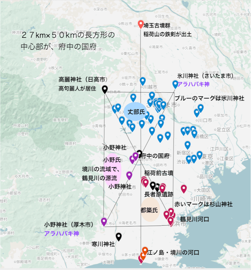 さいたま市の氷川神社から真西27kmに高麗神社が位置し、さらにその高麗神社から真南へ約50kmの地点には、相模国の小野神社(厚木市)が鎮座しています。この厚木の小野神社とさいたま市の氷川神社を結ぶラインは約60kmにおよび、その正確な中心点に位置するのが武蔵国の中心である「府中の国府」です。