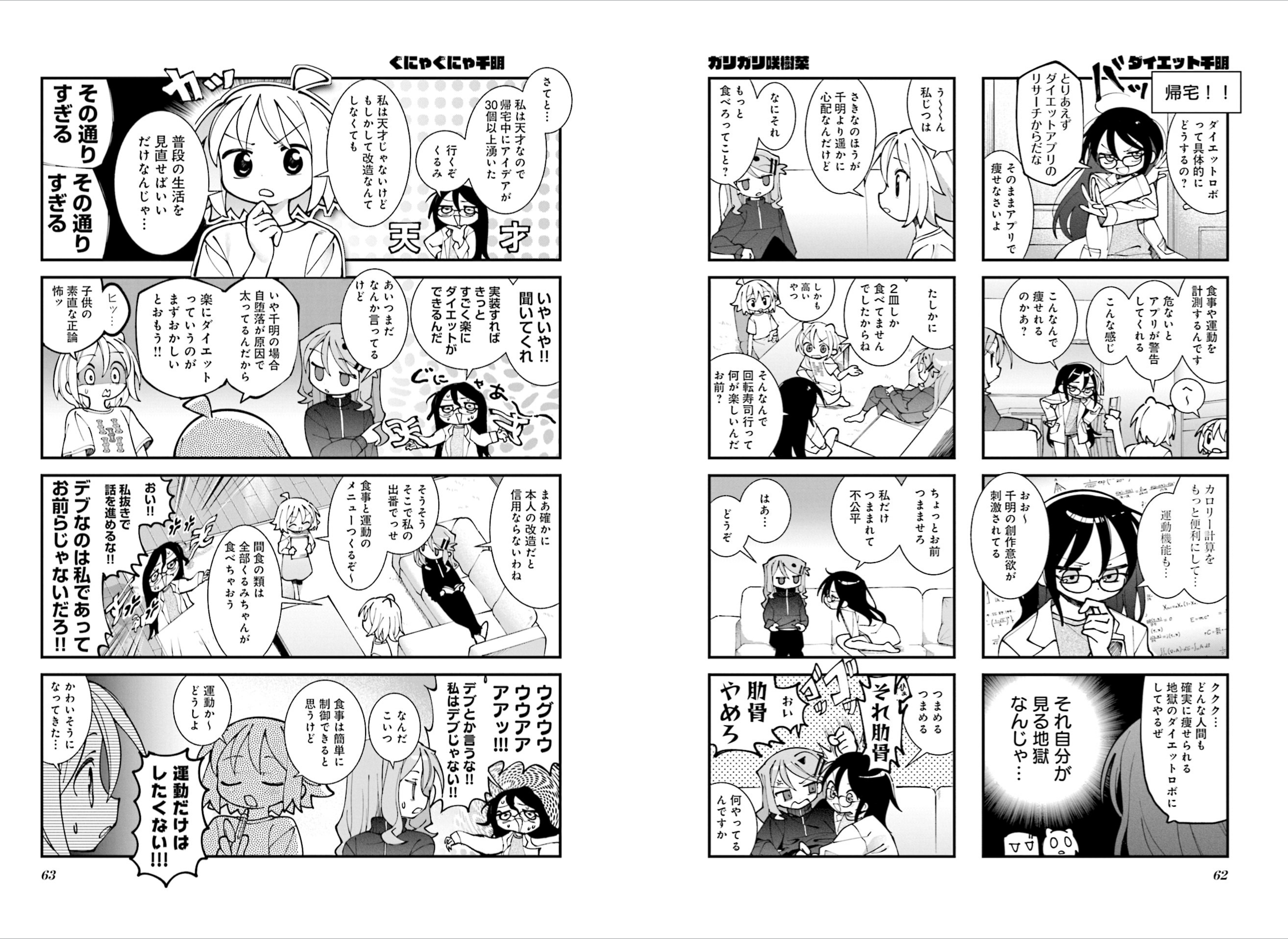 こちらはコミックキューンで連載された、つくみず先生による4コマ漫画です。こちらも星屑テレパスと同様に、コマに用いられている演出の幅に制限がなく、また、4コマのフォーマットの上であらゆる場所・前後左右にコマを割り、非常に情報量が多いため、凄まじい読み応えがあります。また単に、このペンタッチ・画風でここまで読みやすい画面が成立していることはかなり異常だと思いますので、何の参考になるかと言われると全くわからないのですが、まあ4コマはここまでできますよという一例としてオススメです。