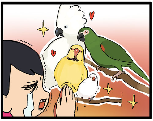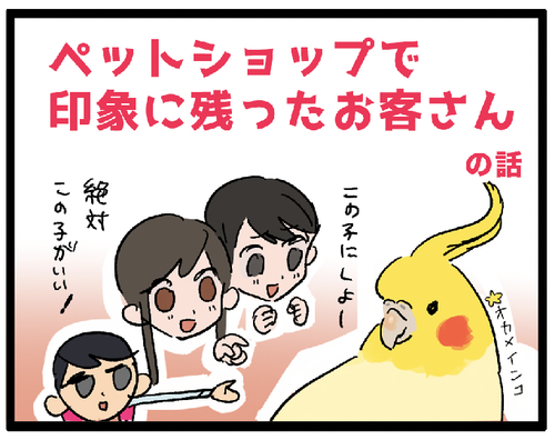 お客さんのハラハラするネーミングセンス ※ところどころフェイクを交えて描いていますお客さんが仲睦まじくてほっこりしました。それにしても焼き鳥……!?どうしてそれにした……!!お迎えされる鳥さんの名前を聞くのがひっそりとした楽しみですが、たまに、お客さんが「元々そう呼ばれてたなら聞き慣れた名前の ... 続きを読む 2021年03月20日