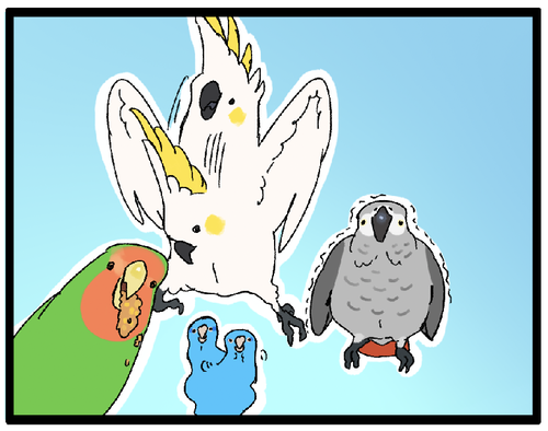 この世の終わりみたいな絶叫をするオウム 爪一本切るたびに叫ぶので8本分の悲痛な雄叫びを聞いた耳がおかしくなるかと思った爪切り時の反応、性格差もあって人間っぽくて面白い子が多いのでシリーズ化したい! ▼キバタンのほかの漫画 白色は本当に可愛いよね…………ぼやきうめ〜〜〜↓よろしくね! にほんブ ... 続きを読む 2021年10月29日