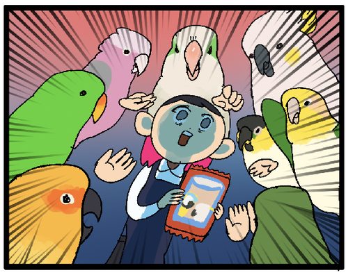鳥部屋に入るとみんなから猛烈なおやつくれコールをされる 鳥たち、部屋に入ってくる人間のことを本当によく見てて、手に持っているのがおやつだとわかると全員で騒ぎ出すしオキナインコは私に対してあたりが強い。 ▼みんな食べろ食べろ〜〜! ▼おやつ食べる? くれるの!?(くれない)ぼやきいつかゴルちゃんに手渡しでおやつ ... 続きを読む 2021年10月31日