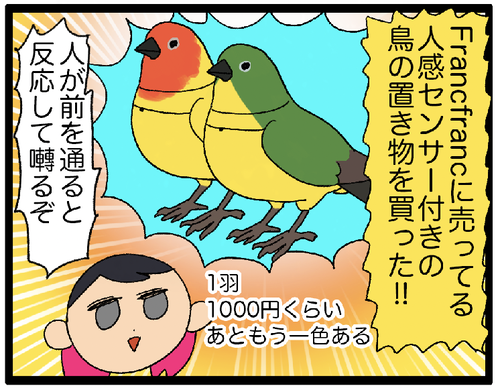 Francfrancで買った鳥のおもちゃ、よかった 家の鳥が増えたみたい〜〜〜〜!センサーに反応して囀るって書いたけど音声自体は何パターンかあって、歌を歌ってくれたりもします。ちなみに私が買った個体は人感センサーが結構シビアで、わざわざ目の前に立たないと反応してくれません。まだお迎えして日が浅いので懐いて ... 続きを読む 2022年03月20日