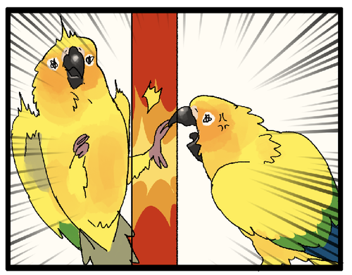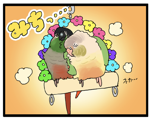 【多頭飼い】鳥カゴ同士の距離に注意!!!!🚗🚗 鳥カゴ(自分のテリトリー内)にいる鳥さんって案外気が大きくなったりするので、鳥カゴ同士の間隔は空けておくに越したことはありません!最低でも鳥さんがカゴの中から足を伸ばしても隣に届かないくらいの距離を空けましょう!▼コガネメキシコインコが登場する別のまんが ( ... 続きを読む 2023年06月27日