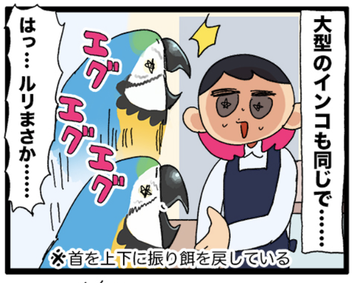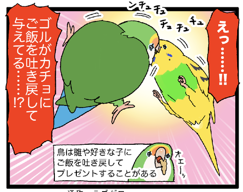 鳥からの要らないプレゼント ちょっと汚い(汚くない)話なのでお食事中の方は注意!!🤮大型の子が首を上下に振った瞬間、緊張感が走る━━ちなみにこの吐き戻しは鳥が食べたばかりのご飯を口から戻してるだけなので、実際そこまで汚くない&臭いわけではないのです。吐き戻しは発情行動なので、あまりやら ... 続きを読む 2023年07月21日
