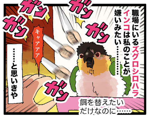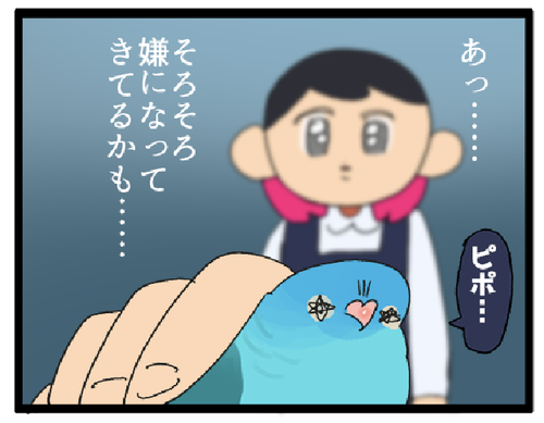 【閉店!】サザナミインコの営業時間、終了 サザナミインコちゃん、露骨に嫌かも…………って顔をしてました長時間触られてて暑がっていたのもある……かも!お客さんに触ってもらっている時も、インコちゃんの調子をよく見るようにしております。▼サザナミインコが登場する別のまんが 演技の良いンコ!!サザナミ便は… ... 続きを読む 2023年09月16日