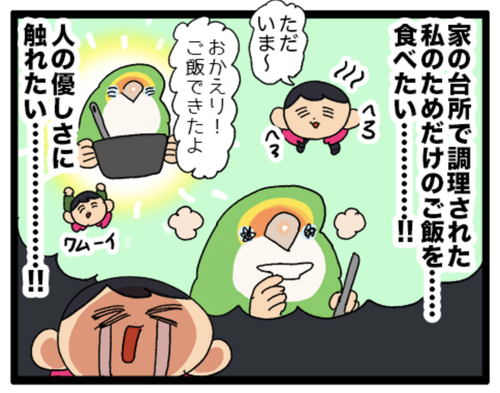 【羽やすめ漫画】謎系インコが泣いてしまいました ▼謎鳥ちゃんが初登場のまんが美味しそうなおやつがお店に並んでたらそりゃ買っちゃうよねこの後皿洗いで無事に4000円は返済されたとさ めでたしめでたし▼羽やすめ漫画のバックナンバー 鳥が主人公の漫画が読める!ぼやきマックの月見バーガー食べました。このソースがウマ ... 続きを読む 2023年09月14日