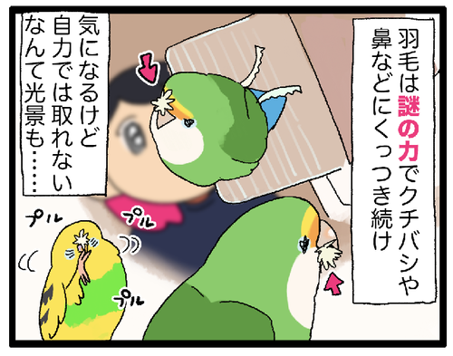抜けた鳥の羽毛、永遠にくっついてる クチバシにくっついてると間違って飲み込んじゃったら……と思って怖くなる!!のでお節介かもだけどとってあげちゃう!鳥の羽毛、あんなに軽いのにめっちゃしぶとくくっつき続けるよね!▼インコの羽のまんが 鳥の羽っていくらでも集められちゃうAmazon / アニメイト(特典あ ... 続きを読む 2024年02月16日