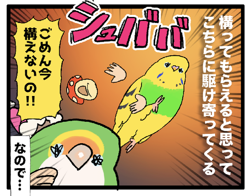 【巻き込み失礼します】鳥屋で頭上から降ってくるもの ンコの話かも前髪にンコつけたまま電車に乗って帰ってきたの……?ってなった😀(鏡見ろ〜〜) ▼ウロコインコと水浴びのお話▼鳥屋のあるある ポピネーター 冗談じゃないあんたが知らなきゃしょうがない泣きたいのは 俺の方だ そんなもん売った覚えはない yeh~~~気まぐれ ... 続きを読む 2024年04月19日