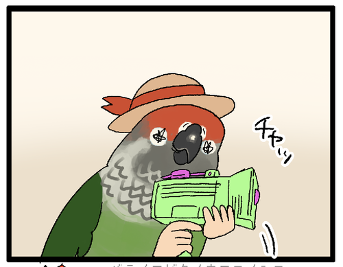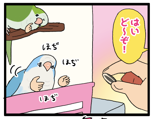 【WIN-WIN】あげたい人間、食べたいインコ おやつを貰ったら速攻で走って逃げていく潔さ…………たまらん……人の手からおやつを奪う時の勢いの良さも癖になるんじゃ▼オキナインコのおすすめ漫画 店員のことをおやつ給餌機だと思ってるかもなぼやき今日はしそ巻きで飲んでます。た、たまらん お米欲しい!!▼クリッ ... 続きを読む 2024年04月17日