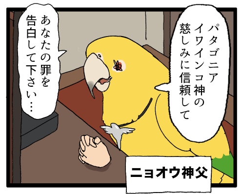 【羽やすめ漫画】おお……偉大なるコニュアの父よ…… ちいさな罪からおおきな罪までパタゴニアイワインコ神はお赦しくださることでしょう……コーニュア(コニュアとは……ウロコインコやコガネメキシコインコなどの鳥さんのグループの名称だよ)▼羽やすめバックナンバ〜〜〜 羽やすめ漫画 その2…… 作りたいかも!ぼやきぼやけ ... 続きを読む 2024年07月14日