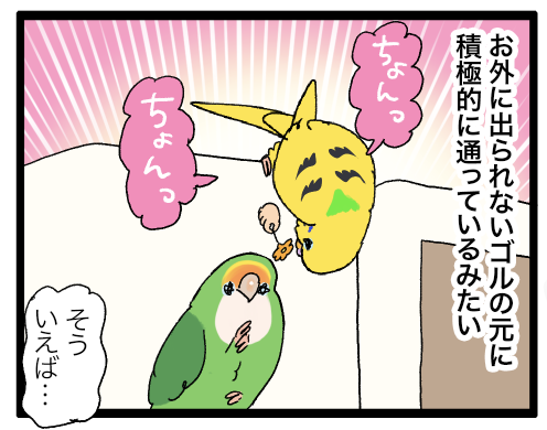 カチョちゃんはゴルちゃんと遊びたい🌷 ▼放鳥STOP中のゴルちゃんです カチョちゃんが放鳥出来なかった時にゴルちゃんがしてあげたことを、今度はカチョちゃんがしてあげてるんだと思ったら尊すぎてマクドナルドの女子高生が車内で拍手喝采でした。▼カチョンツェル▼カチョちゃんと出会った時の漫画 ゴルカチョ近 ... 続きを読む 2024年07月24日