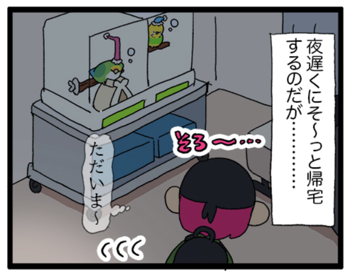 え!?カイヌシ帰ってきたんですか!? スマホで操作できる照明を使っているので外出先から消灯できる!便利!でもおやすみ布はかけられないので、帰宅すると絶対に鳥を起こしちゃう🧐部屋が広かったら鳥さん用のおやすみ部屋が用意できるのにな……!▼鳥を起こさないように……はわりと無理ゲーだ おやすみとい ... 続きを読む 2024年12月14日