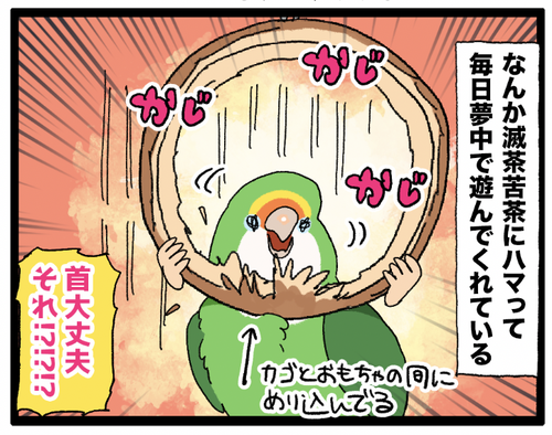 めりこんでますよ、ゴルさん 遊んでくれなかったからと言ってすぐに手放さなくて……良かった〜!鳥さん自身のブームもそうだけど、おもちゃを固定する位置とかも重要なんだな……って思いました。ゴルちゃんはお昼寝してる時以外はカゴの下の方にいることが多いので、おもちゃ等は下の方にある方が喜ん ... 続きを読む 2025年06月28日
