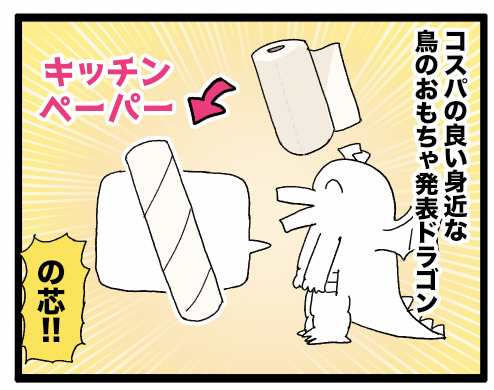 身近な鳥のおもちゃ発表ドラゴン 捨てるだけだった紙製の芯、鳥のおもちゃに早変わり🪀エコですね。鳥屋でもキッチンペーパーの芯のおもちゃ人気は高く(特に大型ちゃん)、芯を持って(誰にあげようかな〜)なんて考えてるとよく鳥さんにくれくれくれ〜!!とアピールをされたり。ちなみに我が家のゴルちゃんはキ ... 続きを読む 2025年07月31日