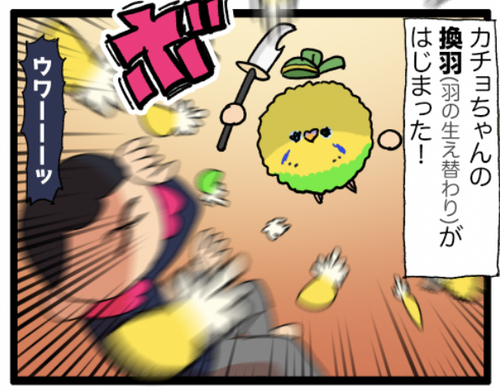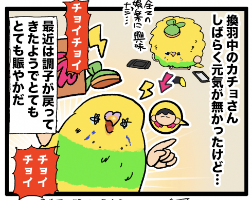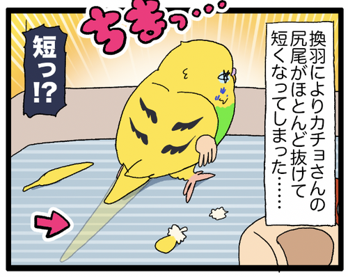 カチョさんの近況:激しく換羽中 ▼換羽とは!?鳥さんのプリティー羽毛が生え変わることだ!セキセイインコの換羽、羽がドワーッと抜けるのでカゴ付近に大量に散らばる羽を見て「来たわね……」という気持ちになる。なった。換羽の期間は特にお野菜やおやつなど栄養の高いものを与えております。早く換羽終 ... 続きを読む 2025年10月18日