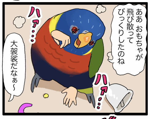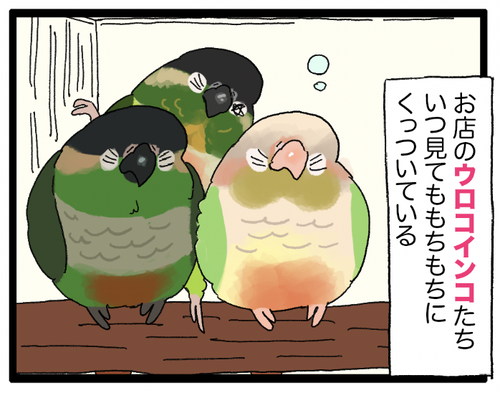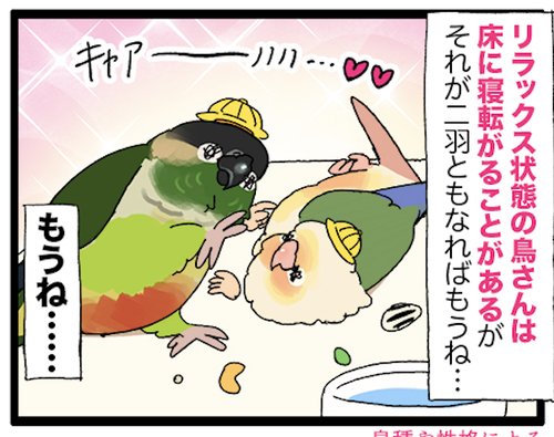 見て ウロコインコが仲良く寝転がっているよ かわいいね 俺が仲良し二羽を……引き裂いた……リラックスしている鳥さんは(鳥種によっては)よく床に寝転がってることもあるけど、=必ずしもニンゲンに慣れているわけではないことに気づけなかったんだ あの頃の俺は Oh~~▼関連のまんが ぼやき値段とかカロリーとか脂質とか色々考え ... 続きを読む 2025年10月20日
