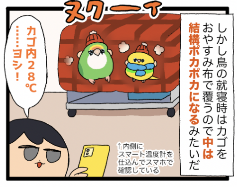 鳥はポカポカ 飼い主ヒエヒエ 鳥たちが快適に過ごせるならいくらでも暖房代を払うけど、飼い主(私)が凍える分には……まあ……(よくない)世界中の家鳥たち、野鳥たち ポカポカでいて━━。(日中カゴ温まらない問題、もっとW数の高いペットヒーターを買えば解決ではある😌)▼ペットヒーターのまんが みな ... 続きを読む 2026年01月23日