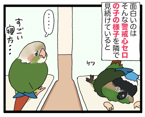 え‼️踏まれてる‼️踏まれてますよ‼️早く気付いて‼️ 体重が軽いので、ちょこっと乗られている程度なら怪我の心配は無いのですが、ちょっと心配になる光景で店員はヒヤヒヤなのでした🙂実際の写真いい寝顔、してるじゃん━━▼関連のまんが 赤ちゃんって…………可愛いよなぁ…………☺️✨カチョを放鳥しているといつもゴルが ... 続きを読む 2025年11月03日