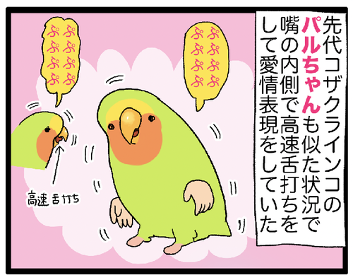 【思い出】カチョちゃん越しに見えるパルちゃんのおもかげ カチョを手で包んで飼い主が顔を寄せるとぷぷぷぷ……って言ってくれる。喜んでくれてるのかな?嬉しい!コザクラインコって嬉しい時にぷぷぷぷぷ……って舌?を鳴らす子いるよなぁって思ってたんだけど、まさかカチョもやるとは……!▼おしゃべりカチョちゃんのまんが ↑飼 ... 続きを読む 2023年11月12日