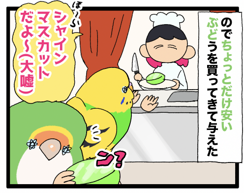輝くぶどう🍇の季節だ! 舌、肥えやがって━━うちの鳥たちは果物は糖度が高ければ高いほど好きらしいです。あんまり何でも食べるタイプの子達じゃ無いから気に入ったものを延々とあげ続けることになる……😂でも鳥が喜んでくれるなら……って思うとまんまと買っちゃう。結局この漫画の後にシャイン ... 続きを読む 2025年09月05日