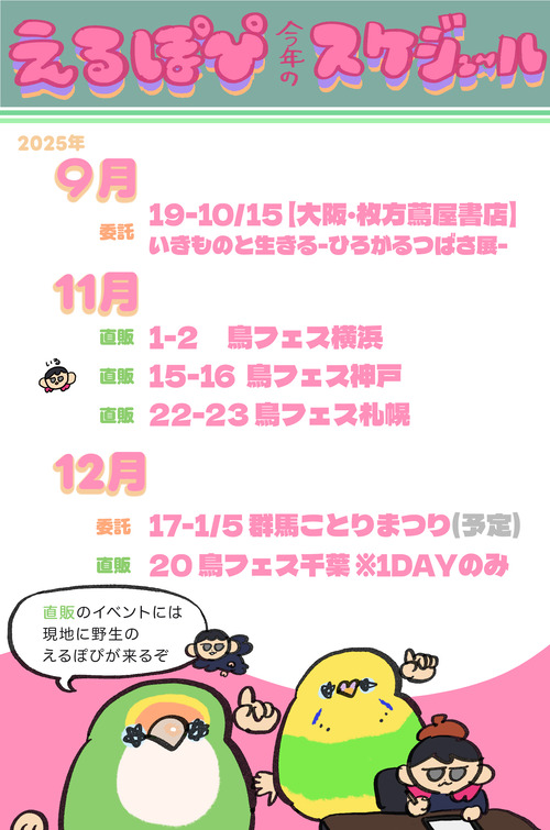 今後のイベント参加予定✍️ / 似顔絵オーダー受付やります ※参加イベントの欄に誤植があったので修正しました。ご指摘下さりありがとうございました!こんにちは、えるぽぴです。今日は漫画をお休みして直近のイベント参加予定をお知らせします🙌直近のイベント参加は鳥フェス千葉です。1DAYのみの参加ですが、新グッズを抱えて行き ... 続きを読む 2025年12月11日
