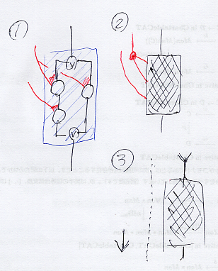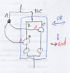 (1)は選言ボックスそのもの、(2)は選言ボックスをブラックボックス化。選言ボックス自体が二面ノードになることがわかる。ただし、選言ボックスの入力は1本、出力も1本に限定する。横からの入力は自由に入っていいとする。その意味で、選言ボックスは、連言環境に置かれた特殊な二面ノードということになる。
