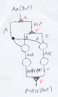 思いついた時系列に沿って説明する。分配法則 A∧(B∨C) ⇒ A∧B ∨ A∧C (シーケント矢印は二重矢印)の証明を、上から下方向のストリング図で描く。