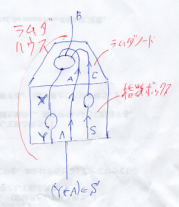 ラムダハウスは関手ボックス/関手ストライプ/オペレータボックスなどと同じ描画法。復圏のなかに別な描画法の領域を埋め込んで描く。領域の形がお家の形なのでラムダハウス〈lambda house〉と呼ぶ。