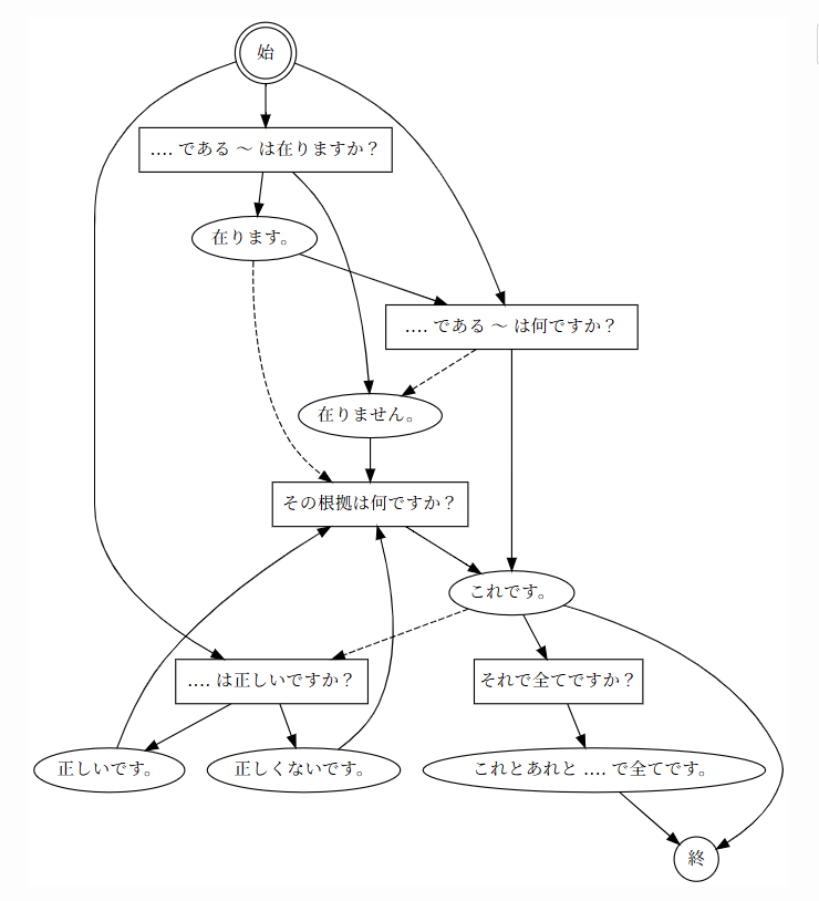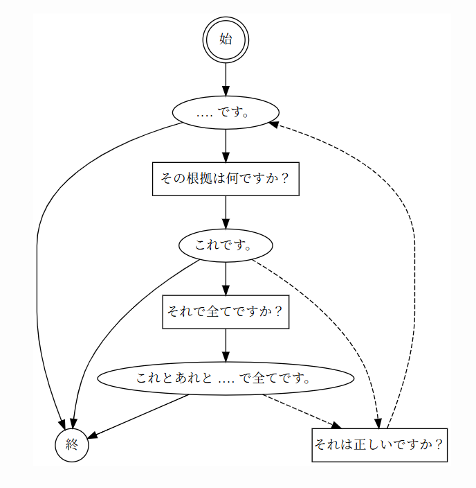 digraph { // 開始 s[shape=doublecircle, label="始"] s -> A_t_Y // 主張文〈Assert〉 A_t_Y[label="‥‥ です。"] A_val_one[label="これです。"] // 質問文と応答 Q_all[shape=box, label="それで全てですか?"] Q_why[shape=box, label="その根拠は何ですか?"] Q_true[shape=box, label="それは正しいですか?"] A_t_Y -> Q_why A_t_Y -> e A_val_one -> Q_all A_val_one -> Q_true[style=dashed]// サイクルの原因 Q_true -> A_t_Y[style=dashed] // さらに応答文と応答 A_val_all[label="これとあれと ‥‥ で全てです。"] Q_all -> A_val_all Q_why -> A_val_one A_val_all -> Q_true[style=dashed] // 終了 e[shape=circle, label="終"] A_val_one -> e A_val_all -> e }