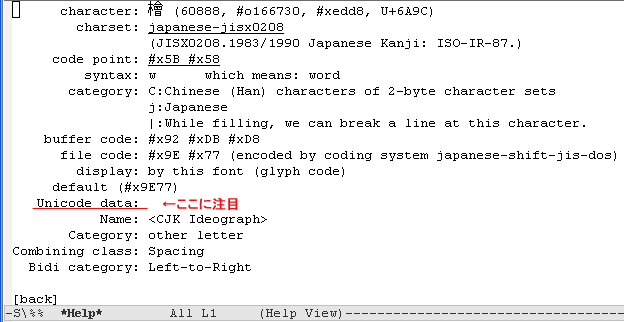 これで、Ctrl+u Ctrl+x = (what-cursor-position detail) においてUnicodeData.txtを使った表示がされるようになります*1。例えば、「檜山」の「檜」にカーソルが乗っている状態で Ctrl+u Ctrl+x = すると: